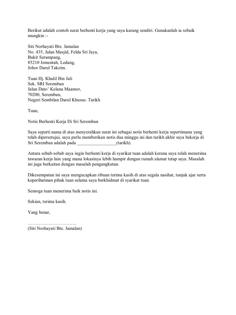 Tuan pengurus kilang botol kicap. Contoh surat berhenti kerja resignation letter. Ingin menyatakan bahawa saya akan meletakkan jawatan sebagai _____ bermula _____2019 dengan notis dua minggu.